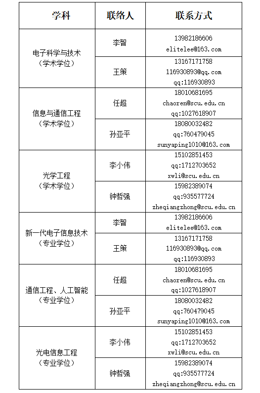 各学科联络人名单(各位同学可先确定拟报考学科,直接和相关学科联络人联系)
