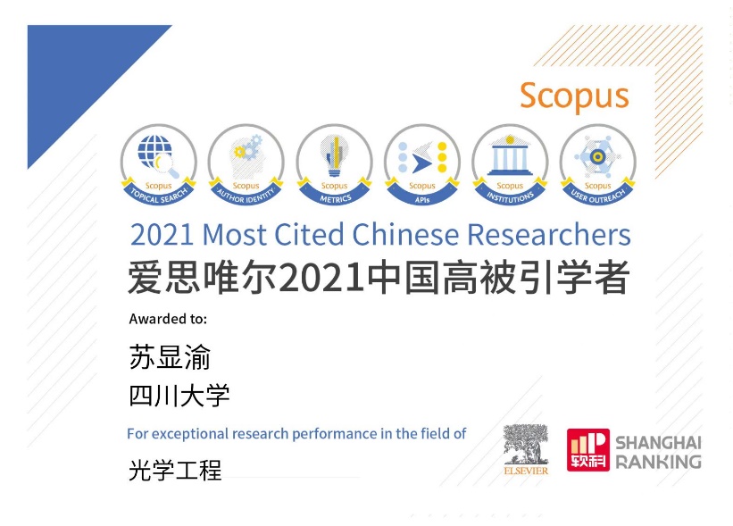 2022年4月14日,全球性信息分析公司爱思唯尔(Elsevier)正式发布了2021“中国高被引学者”(Highly Cited Chinese Researchers)榜单,公司苏显渝教授入选光学工程学科领域名单。2021爱思唯尔“中国高被引学者”榜单以全球权威的引文与索引数据库——Scopus作为中国学者科研成果的统计来源,采用软科(上海软科教育信息咨询有限公司)设计的遴选方法,最终遴选出各学科最具全球影响力的4701名中国学者。