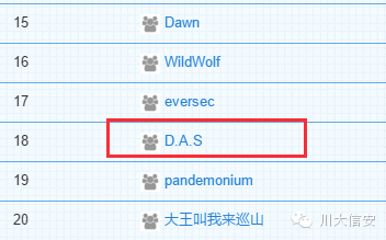 本次“安恒杯”CTF线上赛共计288个队伍报名参加,赛题分为Web题(3道)、加解密题(3道)、安全综合题(4道)、二进制破解题(4道)四个类型。经过。信安所员工团队“D.A.S”经过10多个小时的奋战,共做出1道Web题、1道加解密题、2道安全综合题、2道二进制破解题,总分:1310,排名:18。