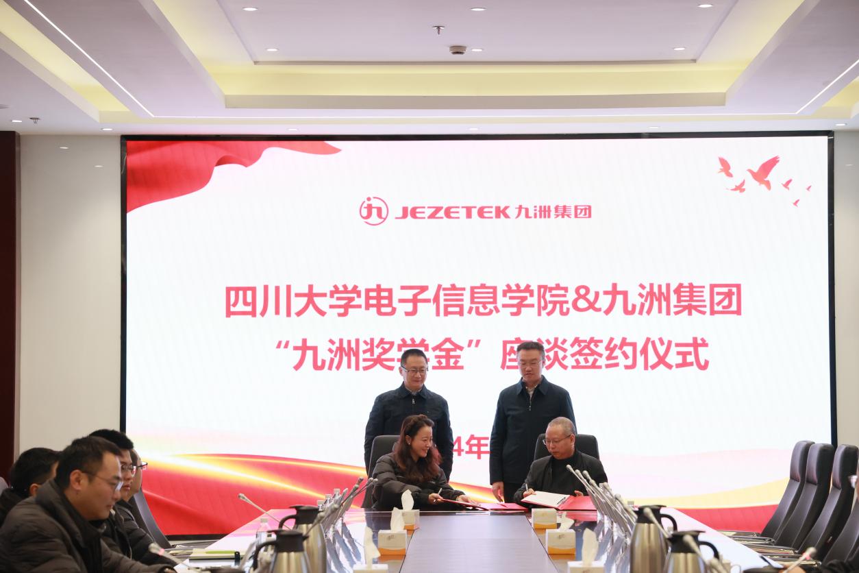 随后,廖勇明和方崇敏签署了九洲奖学金捐赠协议,杨阳代表公司接受了捐赠。