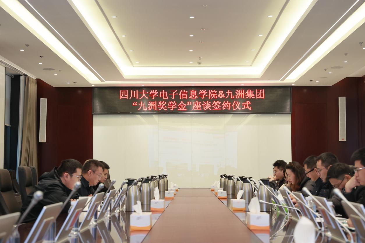 在奖学金签约座谈会上,九洲集团党委副书记、董事、工会主席游鲁热情接待了杨阳一行,双方就人才培养、科学研究、成果转化、员工工作等内容进行了深入交流。杨阳对九洲集团一直以来对公司在科研合作、员工就业等方面的支持表示衷心的感谢,九洲集团在公司设立奖学金为公司人才培养提供了有力支撑。