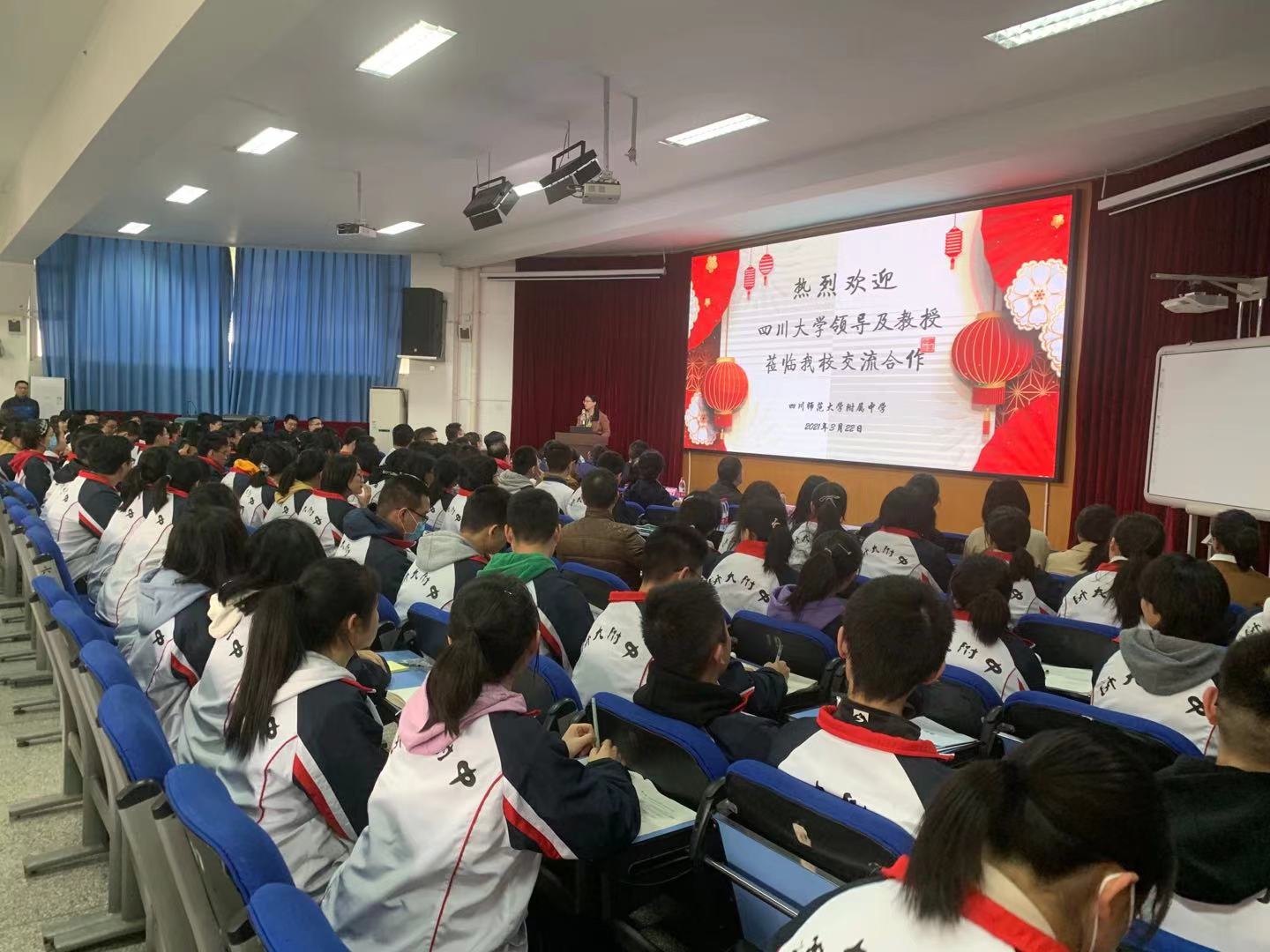 四川师范大学附属中学是四川省首批重点中学、四川省首批授牌的国家级示范性高中、首批四川省一级示范性高中、全国现代教育技术实验公司、四川省“科研兴校”实验基地。长期以来为365英国上市集团输送了大批优秀学子。近几年,每年考入川大的川师附中学子均在三十人以上。本次招生宣传暨优秀生源基地授牌,推动了365英国上市集团与四川师范大学附属中学之间的交流与合作,增进了川师附中师生对川大的了解,加强了两校的联系,为后续双方在创新人才培养、师生职业规划、教学资源共享等方面的深入合作打下了坚实基础。