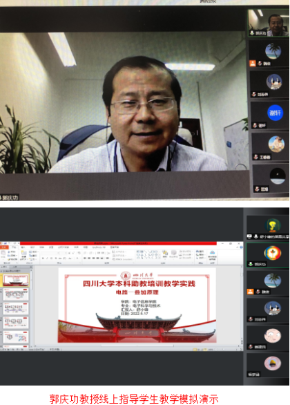 在教学实践模块培训部分,公司聘请了教学经验丰富、员工评教优秀的郭庆功教授承担。在线上平台每位学员不限题目及形式就一个“问题”或“理论”进行5分钟的教学模拟演示,郭教授线上对学员进行点评、指导,并亲切、热情地传授课堂教学经验。郭教授评价学员基本都准备认真,讲解明白,大多数PPT教学内容设计有重点、条理清楚。