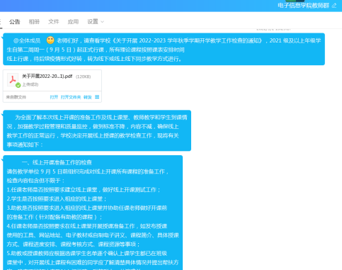在9月5日—9日开学教学检查周中,全院共在线开课93门次,开学教学运行有序进行没有发生任何教学事故。公司十分重视教学检查的各教学环节,开学前做了教学检查安排,并通知所有应开课课程在开课前都建立了师生联系课程QQ群,及时了解线上开课的准备工作及线上课堂、教师教学和员工到课情况,相关开课信息及时在公司QQ、微信群中通知,参与教学检查人员当天都在线反馈检查情况。