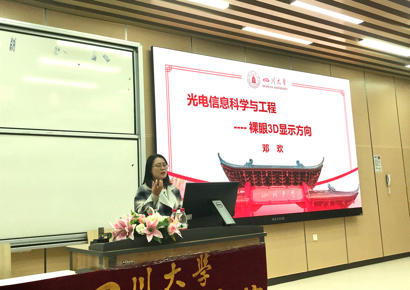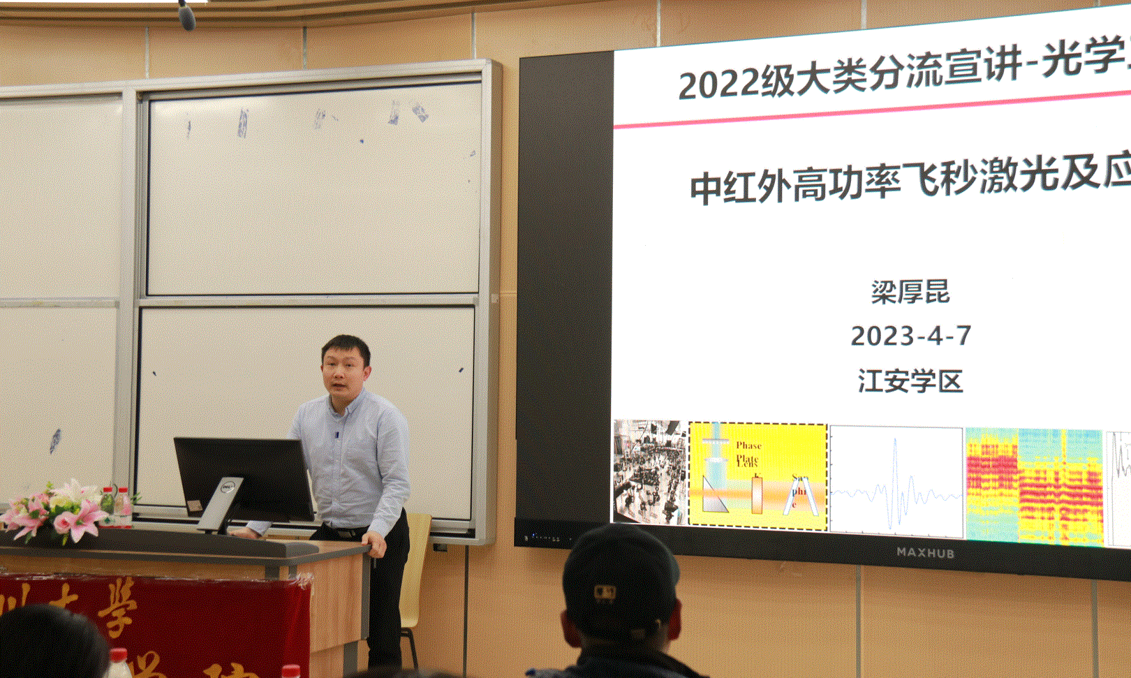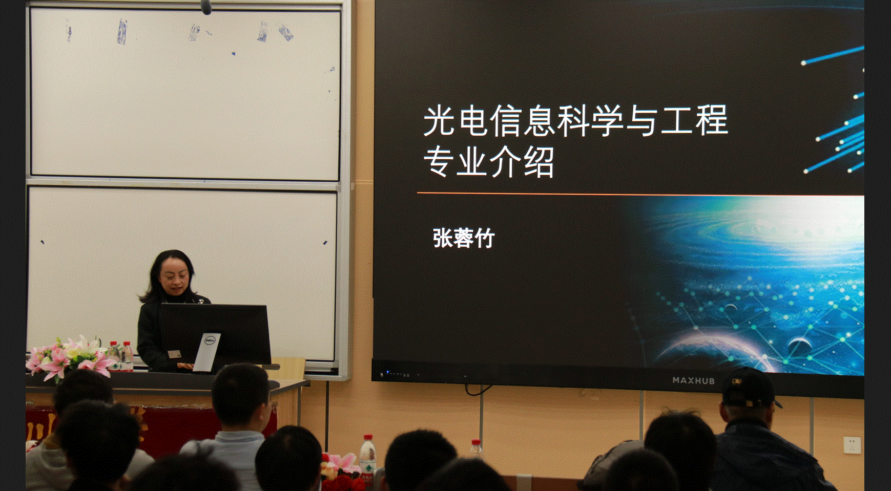 接着,由公司光学工程系组成的宣讲团队进行光电信息科学与工程专业的介绍。首先是张蓉竹老师向同学们重点展示了本专业要学什么、学完之后能在哪些领域干什么等几个员工重点关注的问题进行了详细的介绍,接着由梁厚昆老师,申俊飞老师和邓欢老师分别以实验室的研究方向及相关实验进展做了有趣的讲解,为同学们了解本专业奠定了更好的基础。
