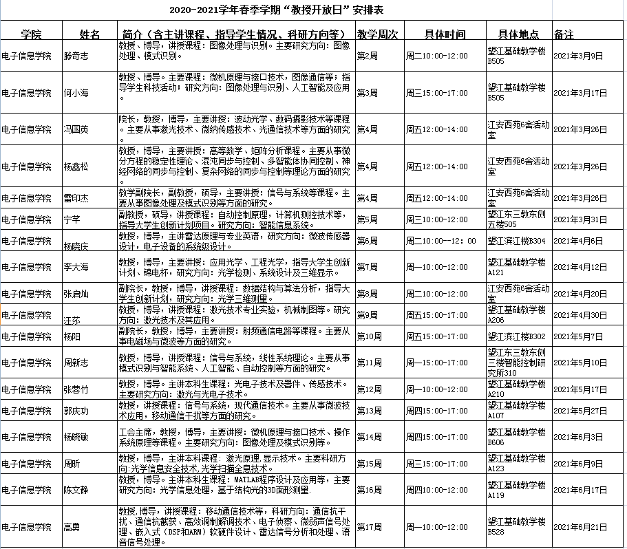 2020-2021学年春季学期“教授开放日”安排表