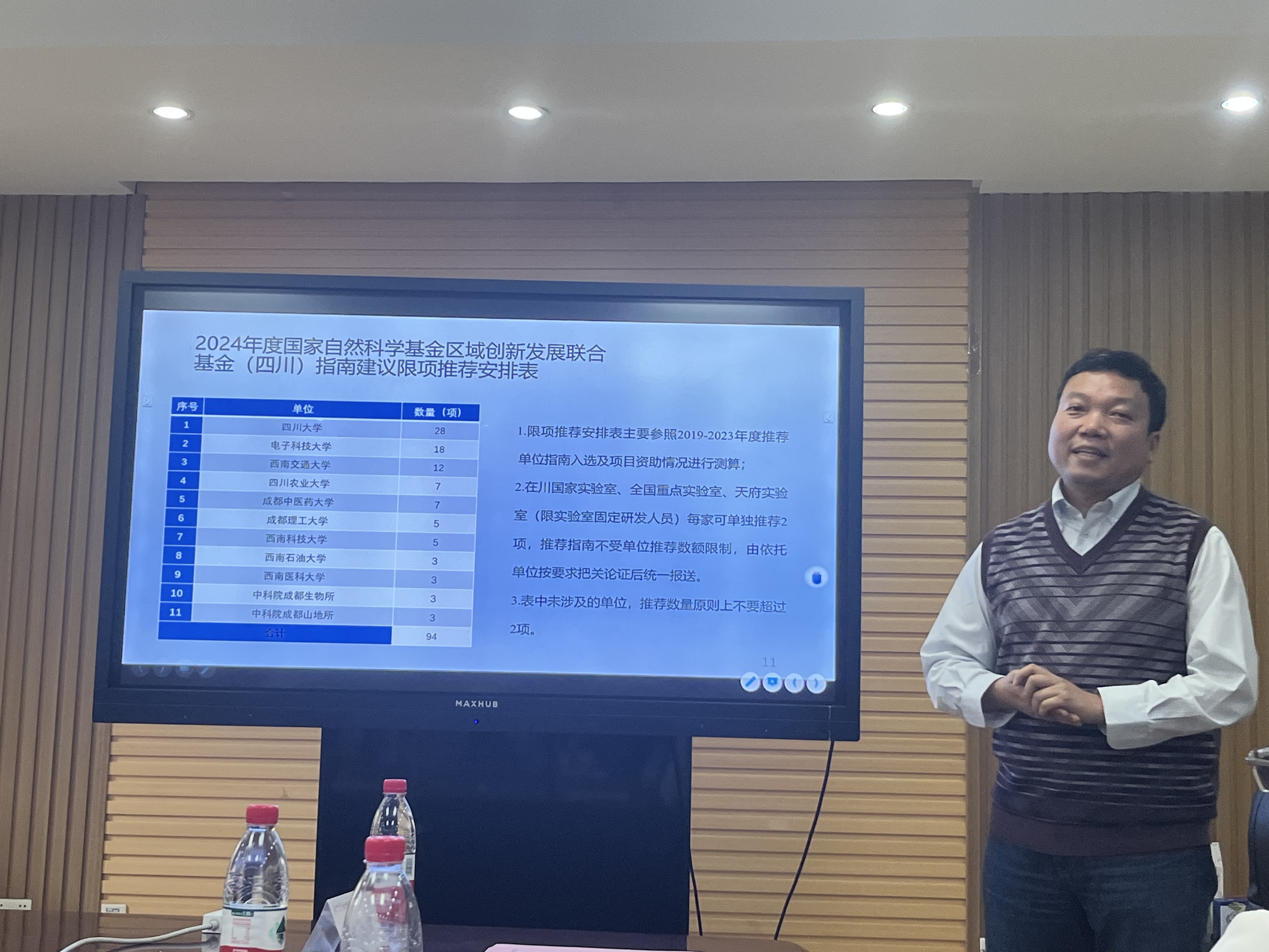 2023年11月9日下午,公司2024年度国家自然科学金申报组织会在基础教学楼A303召开。公司党委书记邰明松、副经理卿粼波、张启灿、雷印杰及20余名教师参加了会议,科研院武梅副经理、基金科朱卫华科长莅临公司指导工作。