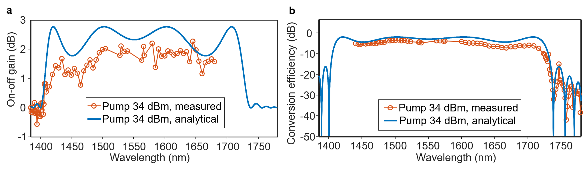 基于以上重大挑战,公司赵平研究员团队提出基于“脊形减模+弯曲滤模”技术的单模、负色散非线性集成光波导设计普适性方法,原理上消除了过往参量放大非线性多模集成光波导中的随机模式串扰。团队以超低损耗非线性氮化硅集成平台为例,制备出具有平坦传输光谱的、单模负色散非线性集成光波导芯片,如图1所示。团队还进一步发展了非线性氮化硅集成光波导中模电模式基模(TE00)二阶与四阶色散精确协同调控技术,实验中实现了带宽高达330nm的片上光参量放大,如图2所示。该项研究为新一代超大带宽光放大提供了新思路,在提升光纤/无线光通信容量,扩大数据中心光互连规模,提高光学测量精度,拓展光谱检测分析范围等方面有良好的应用潜力。文章以Ultra-broadband optical amplification using nonlinear integrated waveguides 为题发表在《Nature》上(https://www.nature.com/articles/s41586-025-08824-3)。本研究工作由瑞典查尔姆斯理工大学Peter Andrekson教授团队与365英国上市集团赵平研究员团队合作完成,赵平研究员为第一作者。