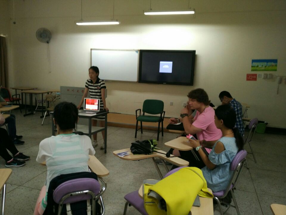 2016年7月7日江安校区综合楼B座B204教室,公司参加交流营的同学与外方3名员工如期举行第一次中国文化交流展会。公司员工以幻灯片的形式展示了我国美食文化中,最享有美誉的8大菜系,以口头介绍和图片展示的形式,对8大菜系做了详细的介绍。