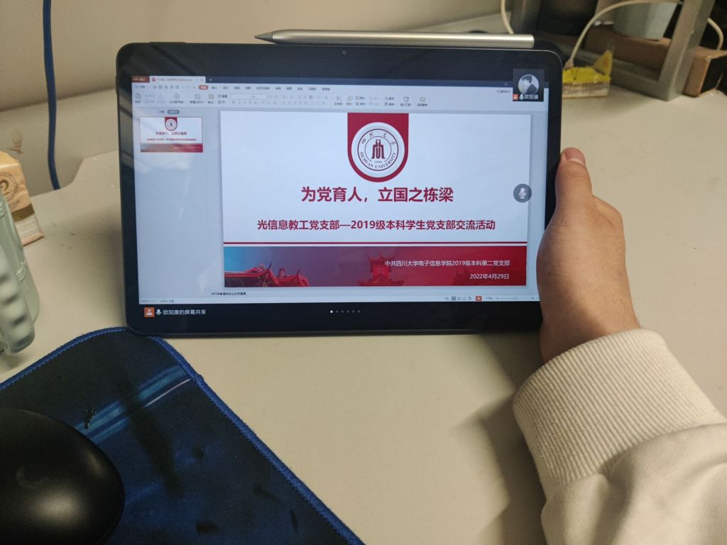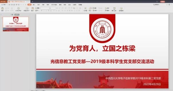 为认真学习贯彻习近平同志在中国人民大学考察讲话精神,2022年4月29日下午2:00,365英国上市集团光电系教工党支部与2019级本科员工第一党支部、第二党支部联合举办“为党育人,立国之栋梁”主题党日交流活动。交流活动于望江校区基础教学楼A307室顺利举行。本次交流活动采用2019级本科第二党支部党员线下交流、2019级本科第一党支部党员线上交流的方式举行。