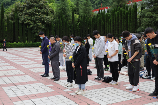 活动的第一站,讲解员带领同学们前往漩口中学地震遗址。眼前的废墟触目惊心,台阶的正中屹立着定格于14点28分的时钟雕像,记录下这个令全世界都难以忘记的瞬间。为逝者举行默哀仪式后,同学们前往救灾浮雕前有序献花,深切悼念遇难同胞和在抗震救灾中牺牲的英勇烈士。