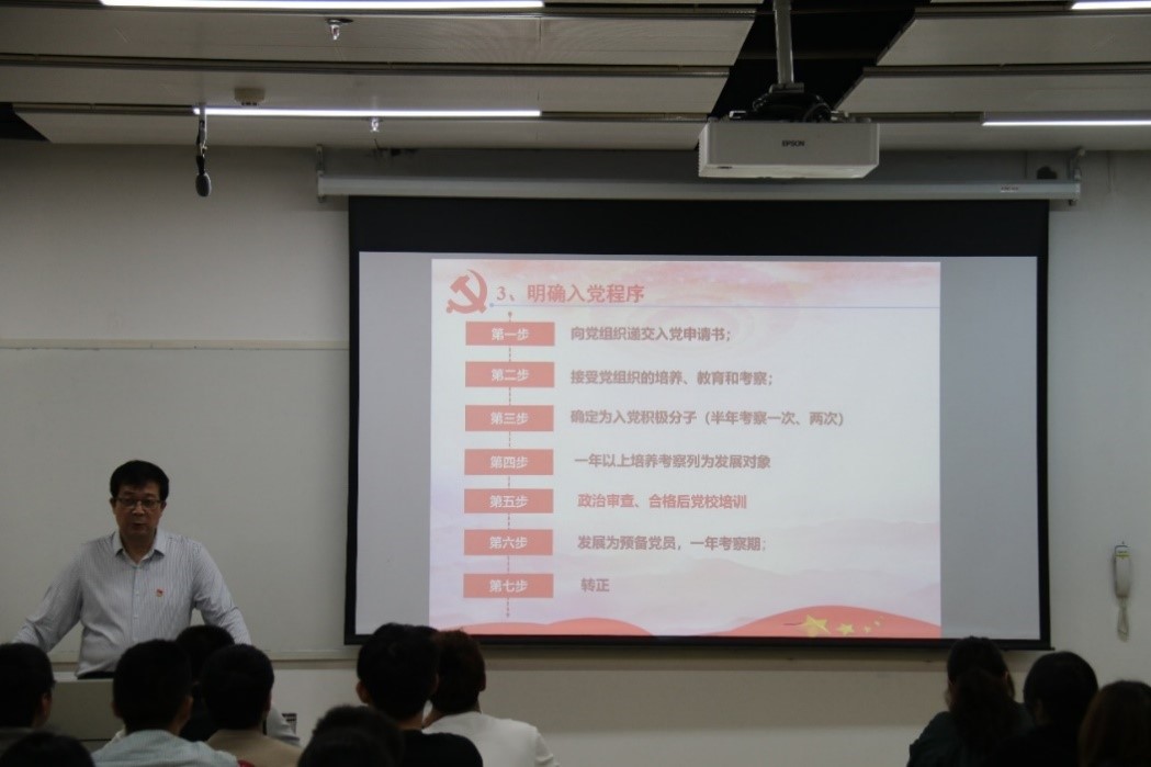 随后,邰明松详细介绍了成为一名共产党员的基本条件,强调申请入党要从思想和行动上承认中国共产党的纲领和章程,执行党的决议,并明确了入党的程序,指出端正入党动机是争取加入党组织的前提。邰明松书记从思想政治、道德品质、学习态度、工作能力、心理素质等方面论述了成为一名老员工党员的标准,鼓励同学们要以自己的实际行动,积极向党组织靠拢。