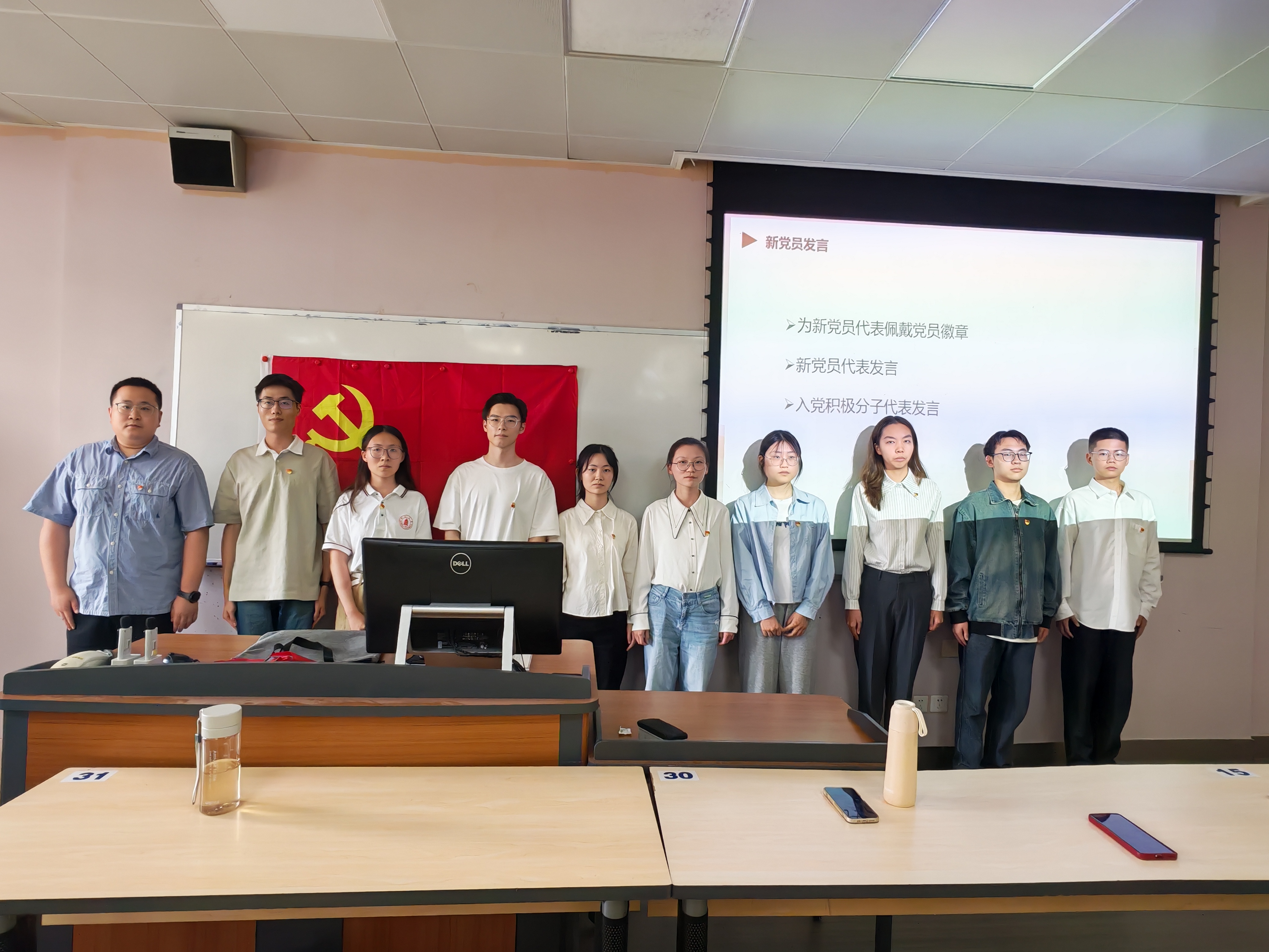 全体党员和入党积极分子起立,齐唱国际歌。随后,新党员起立,举起右手,在申鑫同志的带领下,入党宣誓,饱含对党的忠诚与为共产主义事业奋斗终身的坚定信念。宣誓后,申鑫为每位新党员同志佩戴中国共产党党员徽章,新党员代表易音彤同学和入党积极分子代表刘昕睿、胡源小卷、赵培凯同学依次上台发言,他们用真挚的情感表达了为党和人民事业贡献青春力量的决心,字里行间洋溢着新时代青年的热血与担当。