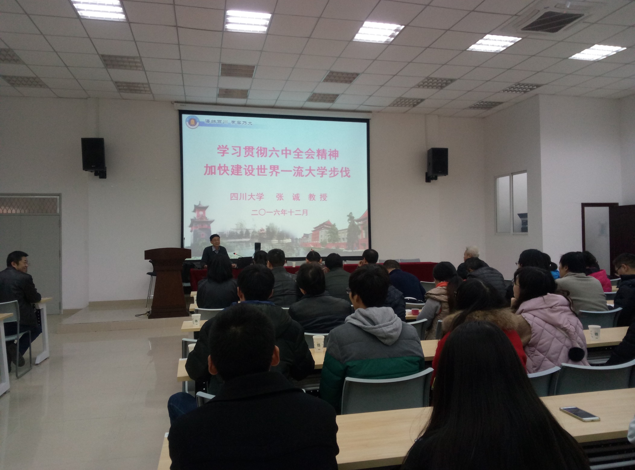 2016年12月15日上午10:30,电子信息公司党委在望江校区五教附一楼101会议室举行“党的十八届六中全会精神宣讲报告会”,特邀公司宣讲团成员张诚教授主讲。报告会由公司党委书记蒋斌同志主持,公司领导班子成员和党员师生职工参加了宣讲报告会。