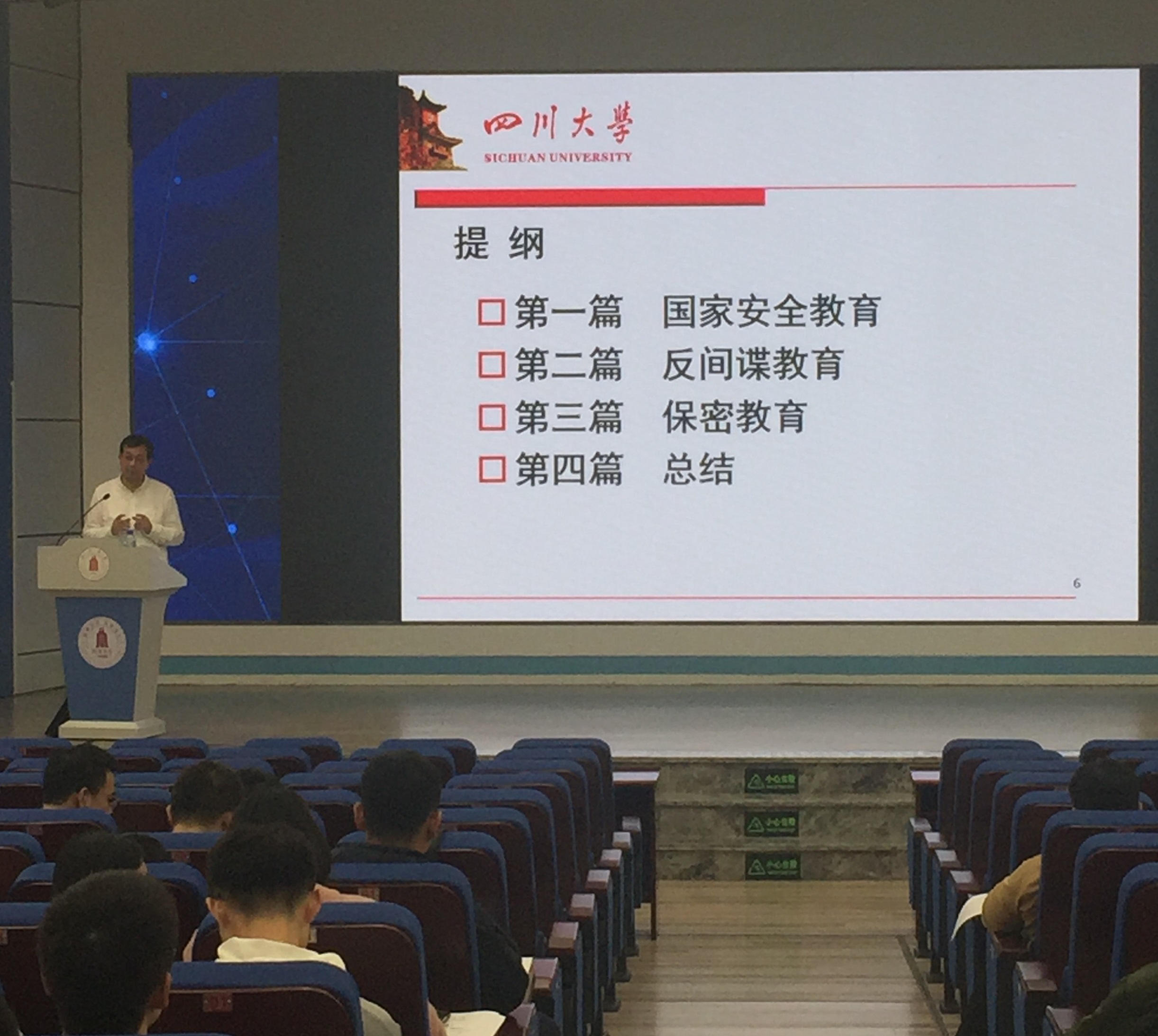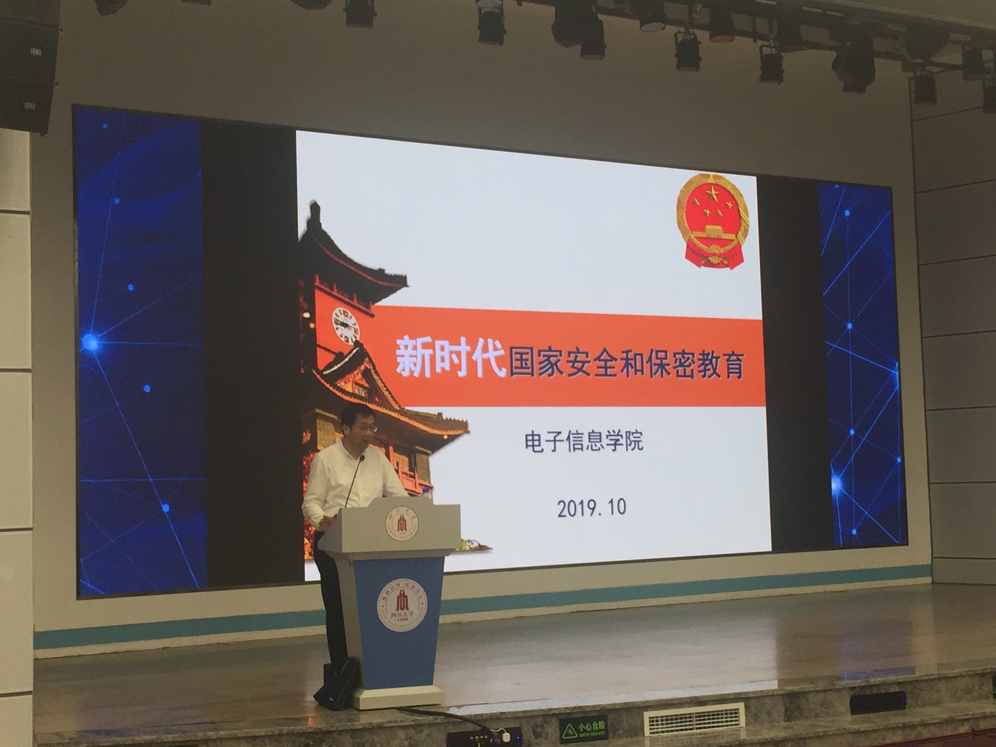 2019年11月1日下午,在望江校区东三教学楼演播厅,电子信息公司党委书记邰明松同志为公司2016级部分本科生讲授了题为《新时代国家安全和保密教育》的专题思想政治理论课。