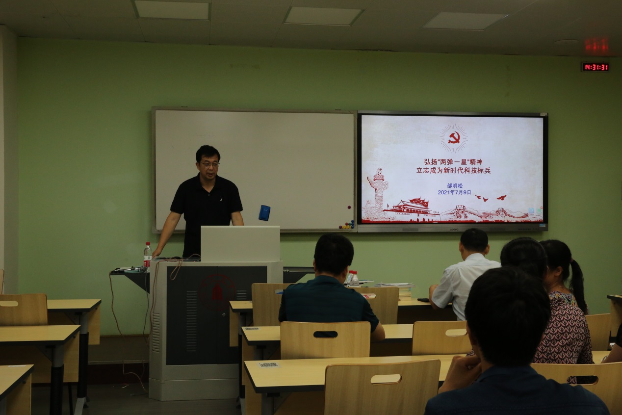 接下来,邰明松从两弹一星,扬眉吐气、两弹一星研制成功的秘诀、牢记奋进使命,登高望远立志成为新时代科技标兵三个方面进行了讲解。从中国是在怎样的核威胁阴影下,做出发展核武器战略决策、严峻形势下,中国“两弹一星” 成功之路两个方面详细解读了研制成功两弹一星,为中国扬眉吐气;从党的领导和集中力量办大事的中国社会主义体制、机制、爱国主义、集体主义、科学精神四个方面,以及邓稼先、郭永怀等先辈的事迹详细解读了两弹一星研制成功的秘诀;从全面建设社会主义现代化国家、学科跨越发展工程两个方面,结合公司有70年党龄的退休老师匡一中教授以90岁的高龄坚持在家里开展科研的感人事迹,详细解读了牢记奋进使命,登高望远立志成为新时代科技标兵这一主题的深刻含义。