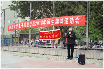 冯国英经理在短暂的开幕式上致辞,并代表公司向全院师生致以亲切的问候,感谢广大师生的热情参与,希望广大师生通过本次运动会能在“双一流”建设中适时舒缓工作压力,进一步增强团结意识,并祝愿大家赛出水平、赛出乐趣。之后,电子信息公司党委邰明松书记宣布本届趣味运动会开幕。