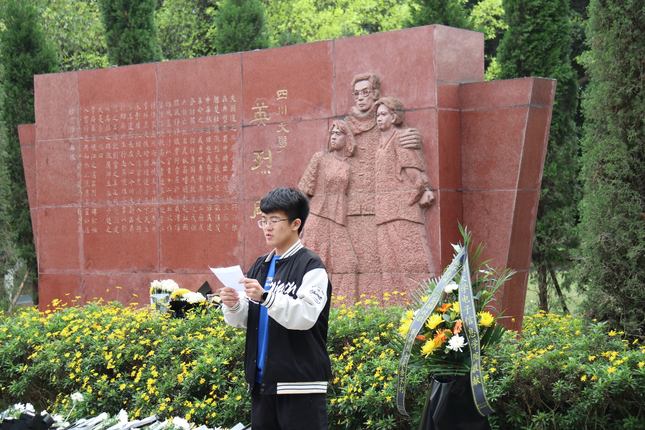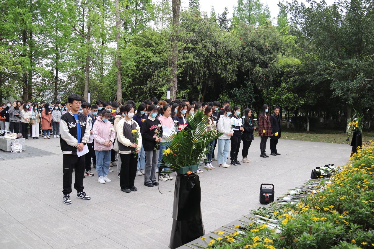 献花活动于4月1日13点在江安校区英雄纪念碑前举行,公司许多同学积极到场参与活动。活动现场气氛庄严肃穆,师生穿着整洁得体,一个个花篮、一枝枝鲜花,寄托着人们对烈士的深情追思。在两位老师的组织下,公司全体代表人员手捧鲜花,向革命先烈默哀一分钟。默哀完毕后,由2021级单文浩同学带领同学们进行宣誓。在宣誓过程中,同学们表情严肃,举止庄重,声音坚定且铿锵有力。宣誓完毕后,老师代表、员工代表依次向革命先烈献花,师生瞻仰革命烈士纪念碑,表达着对革命烈士深切的缅怀和崇高的敬意。
