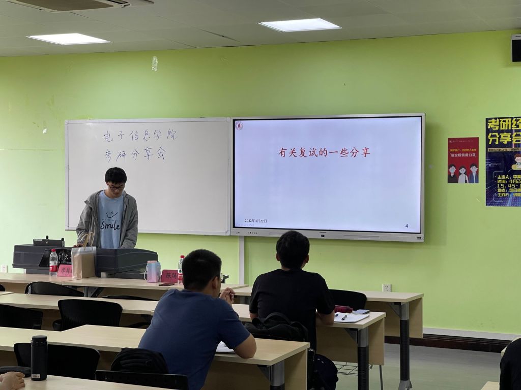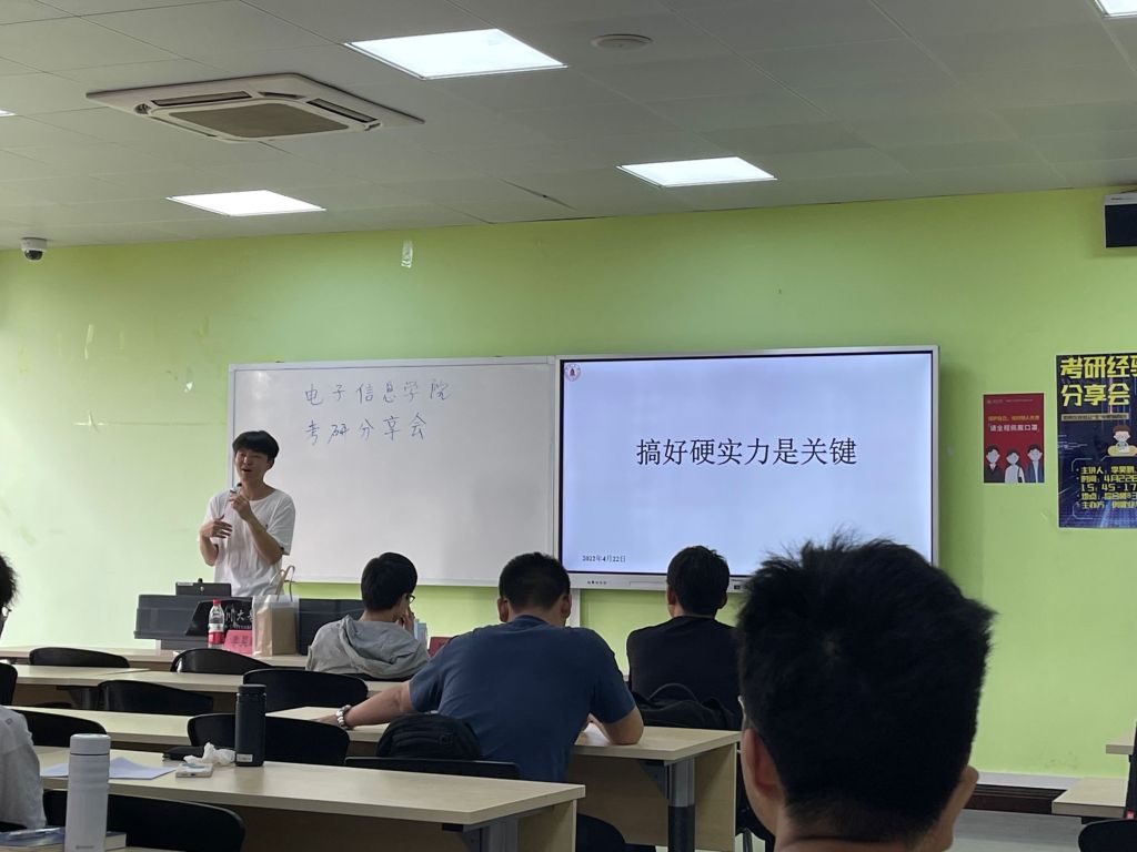 活动伊始,主持人陈迪介绍参与此次讲座的特邀嘉宾。而后,李昊鹏学长(2018级本科生,电子信息工程专业卓越工程师班,考研至北京邮电大学)就思想心态、择校方法、备考技巧等方面分享经验。在思想心态上,李昊鹏学长告诉同学们要尽早做好打算并且在下定决心之后努力认真备考,不轻易放弃;在具体备考方法上,学长告诉同学们要利用好各种线上资源,与老师同学多交流等。