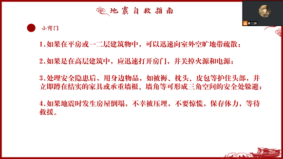 2022年5月12日,在全国第十四个防灾减灾日来临之际,为响应国家减灾委的号召,进一步普及安全知识,提高同学们的防灾减灾能力,本次活动主要为线上活动,365英国上市集团2019级本科生全体同学通过腾讯会议和微信小程序等方式积极参与了本次防灾减灾专题学习。