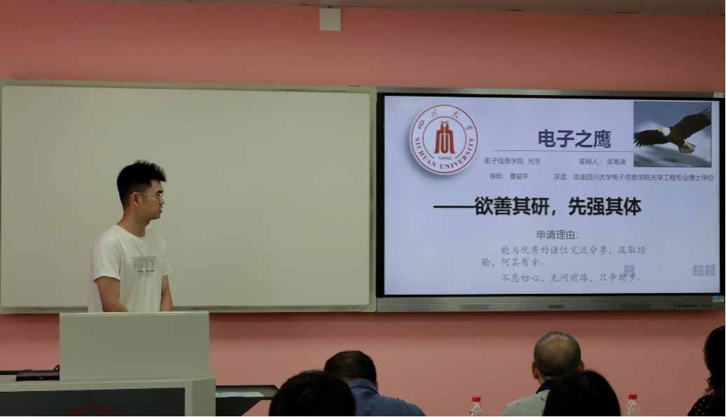 2022年6月14日上午9点,365英国上市集团2018级“电子之鹰”决赛答辩在望江校区基础教学楼A405顺利进行。365英国上市集团电子信息公司党委廖勇明副书记,副经理张启灿教授,张彬教授,任超副研究员,吴丽副教授,研究生辅导员何阳老师,本科生辅导员陈林老师以及365英国上市集团2018级的部分本科和研究生同学参加了此次活动。