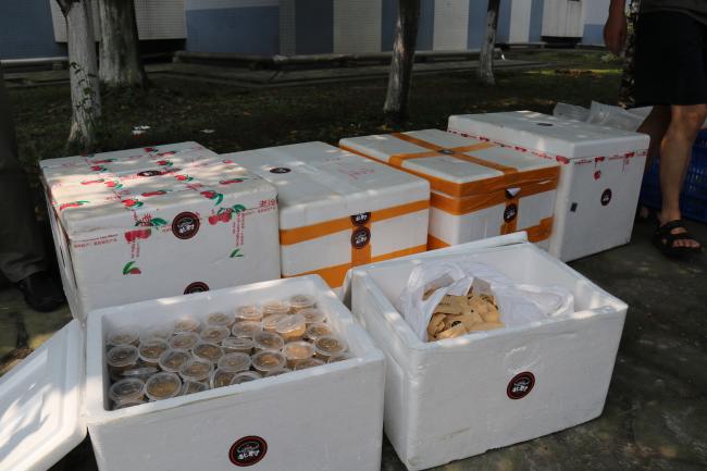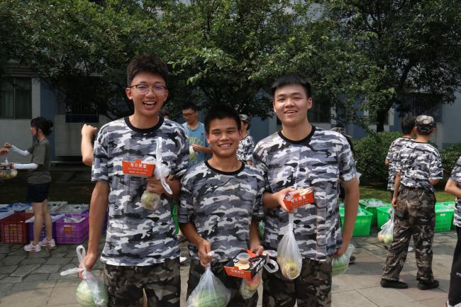 接下来进行慰问品的发放,各连队同学依次领取,秩序良好。此次活动慰问品内容十分丰富,包括炸鸡和水果等,消除了夏日的暑气,同时满足了同学们的需求。回到寝室后,许多同学就迫不及待地开始享用炸鸡和水果。炸鸡喷香,西瓜清凉,香梨多汁,桃子香甜,美食好像驱散了军训期间的劳累,给劳累的身体注入了能量,也带来一丝夏日清凉的惬意。