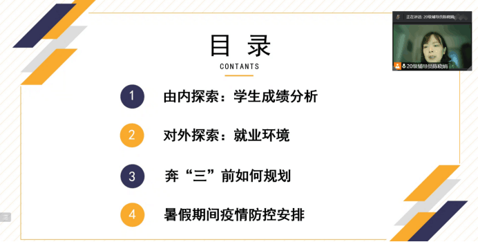 本次家长会的主要内容为“由内探索:员工成绩分析”、“对外探索:就业环境”、“奔‘三’前如何规划”、“暑假期间疫情防控安排”四个部分。