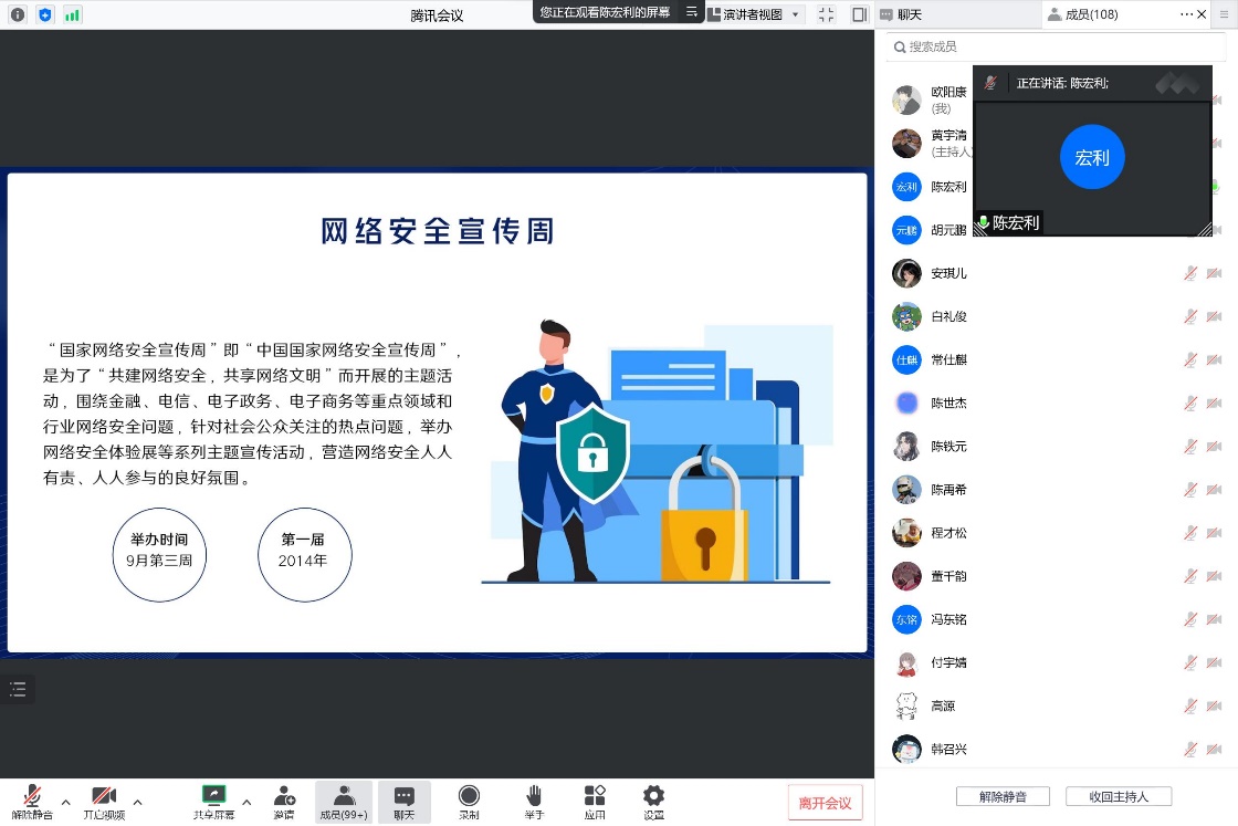 2022年9月23日下午两点至两点半,2019级本科员工第一党支部、第二党支部于腾讯会议线上联合开展了2022网络安全宣传周学习活动。本次活动由第一党支部组织委员陈宏利同志进行分享交流,第一党支部、第二党支部全体预备党员参加学习。