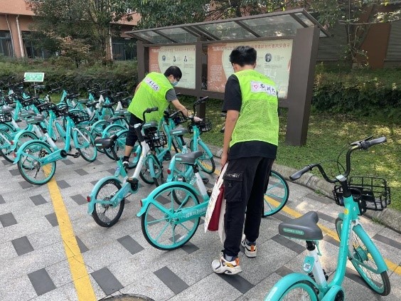 志愿者张贴宣传标语 志愿者将共享单车摆放整齐