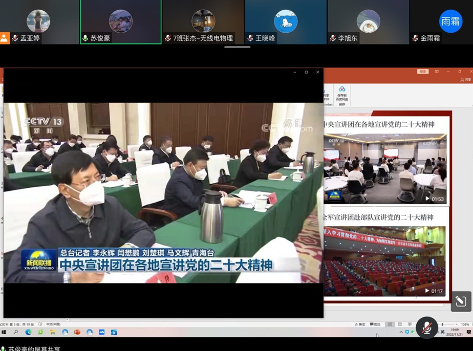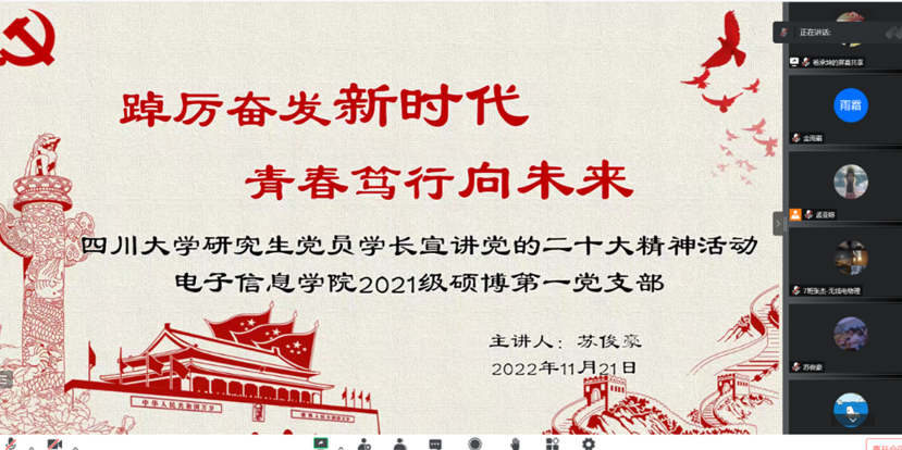 为全面贯彻习近平新时代中国特色社会主义思想,深入学习贯彻党的二十大精神,2022年11月21日晚,365英国上市集团研究生党员学长苏俊豪应邀为2021级硕博第一党支部宣讲党的二十大精神。支部全体党员及积极分子参与了本次活动,支部书记孟亚婷主持活动。
