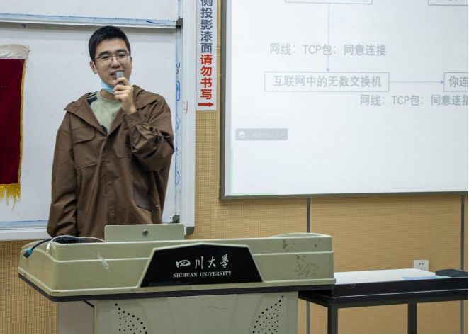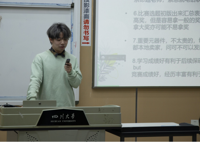18点15分,宣讲会正式开始,本次宣讲会三位学长依次上台,介绍了他们的个人经历以及获奖情况,随后从竞赛需要的知识储备、如何做好团队配合 、海光杯之外的一些比赛等几方面向同学们科普了海光杯电子科技创新大赛等一系列比赛的大概情况 ,同时学长们又以前几年的比赛题目为例,向同学们展现了电子科技创新大赛的具体情况。同学们对此热情高涨,虽然有的同学因为疫情或是一些其他原因不能够参加线下的宣讲会,但他们也选择了线上收听的方式听完了这次宣讲,整体的气氛活跃。