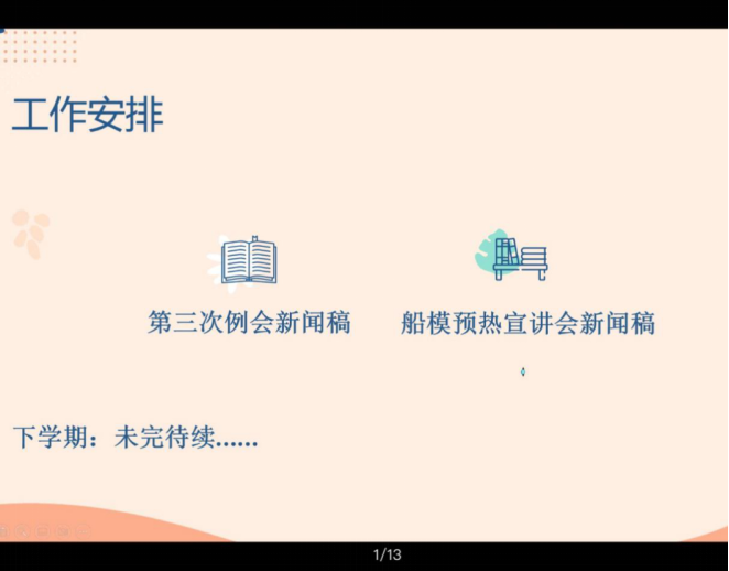 首先,由主席团成员对本学期主席团的工作进行了总结。紧接着,分别由技术部肖迪同学,行政部施金住同学,宣传部孔令杰同学及外联部沈琳鸿同学总结汇报本学期各部门的工作情况并对下学期的部门工作做了初步的安排。最后,对下学期即将举办的船模大赛的内部宣传极大地调动了同学们的参赛积极性。