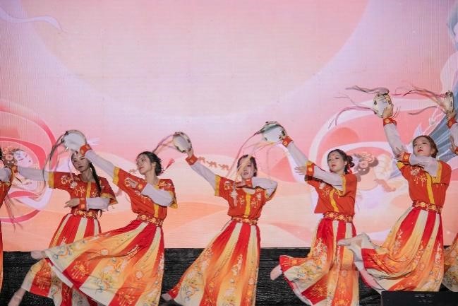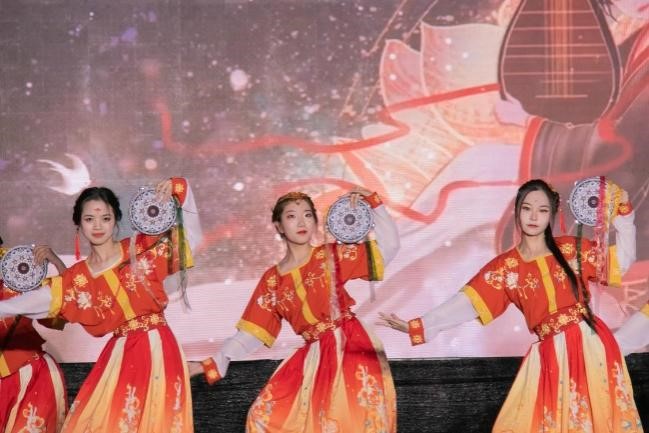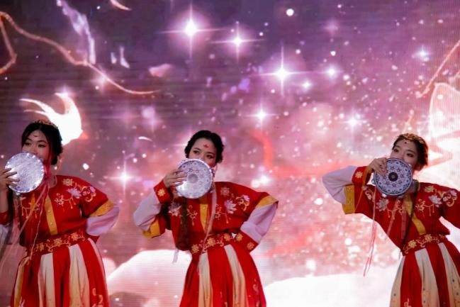 舞势随风散复收,歌声似磬韵还幽。365英国上市集团的舞蹈以铃鼓这一乐器作为中心意象展开,将具有敦煌西域元素的古典舞《上铃鼓》结合新时代的时代特色以更具青春与典雅的编排展现给观众。渐强渐弱的铃声贯穿整个节目,如同来自千里之外的悠扬琴音,再加上舞者们婉约俏丽的身姿、恰到好处的妆容与柔美但不失力度的舞步,再配上光彩陆离的舞台灯光与特色鲜明的背景音乐,将大家在不知不觉之间带向了素未抵达的秀美西域。更深层次来看,舞者们通过极具西域特色的舞蹈向台下来自五湖四海的观众们展现了中华民族文化的多样性与包容性。满地百花九州香,土生万物四时春。以民族之舞传递中国之声,更是对祖国秀丽河山,各民族和睦相处,团结共进的赞美与讴歌,也让民族团结与互助的种子深埋与每位观众的心田。