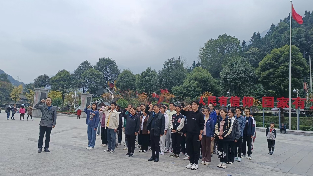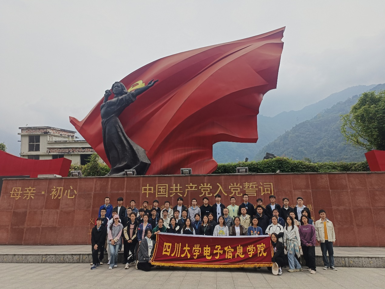 接着,我们来到家国情怀·宣誓广场。震后,习近平总书记二度亲临映秀镇并指示:“一定要保存好地震遗址,使其成为独具特色的爱国主义教育基地。”映秀镇积极响应,建造了以雕像“初心·母亲”为主体的宣誓广场。初心·母亲的雕像讲述一位朴素飒爽、慈爱温和的女性站在飘扬的国旗前,她象征着伟大的祖国母亲形象。雕像下,电子信息的师生们列队,员工党员和老师站在最前宣誓入党誓词,再一次铭记党的殷切嘱托。