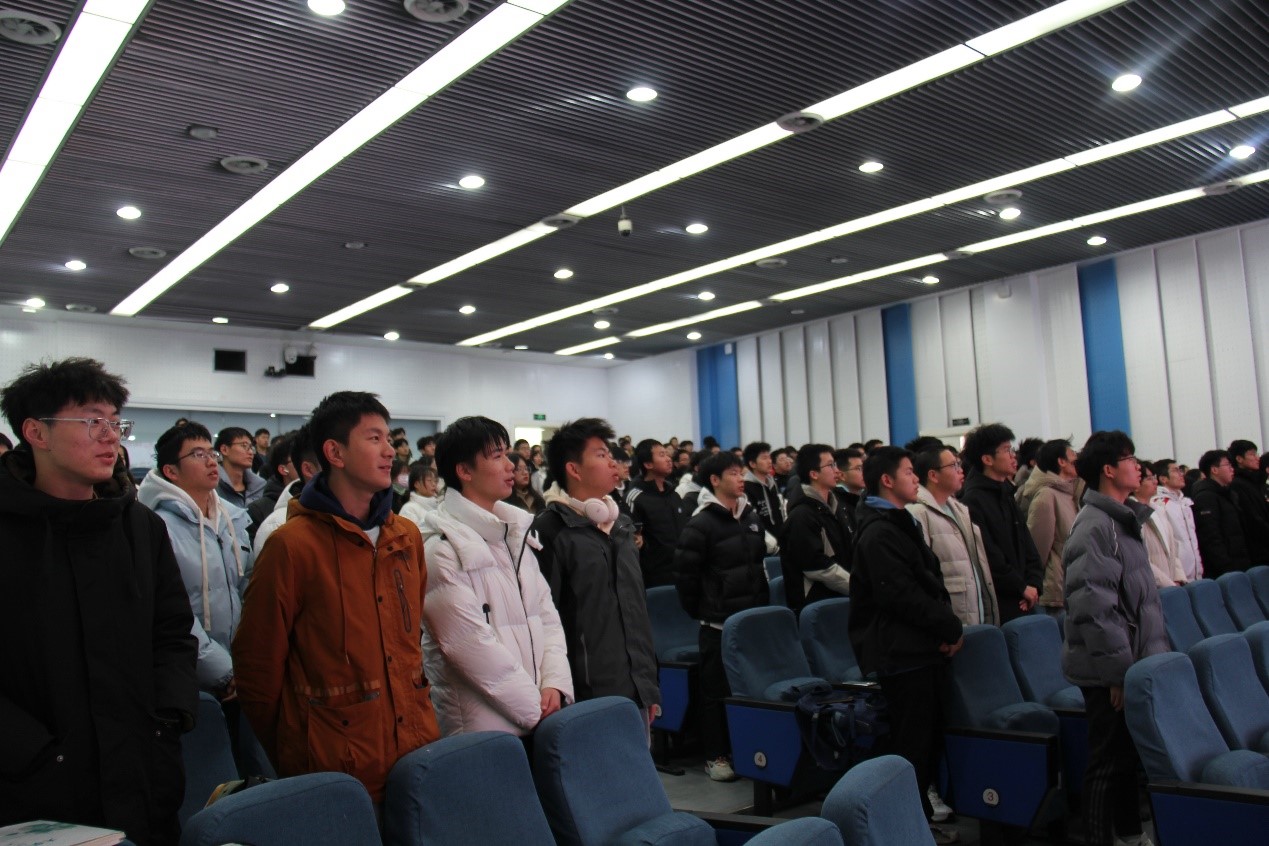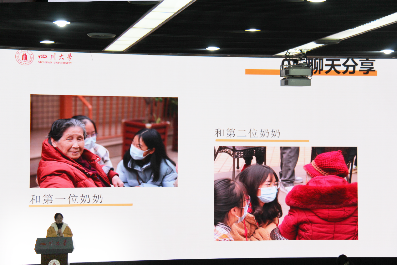 行课开始,主持人颜颖芝和杨鹏俊带领全体学员重温团歌。随后活动进入授课主题,由各班参与“应对白发潮,弘扬敬老风”社会实践活动的同学上台讲述活动过程,分享自己参与活动的思考与感悟,并鼓励同学们多关心老人群体。
