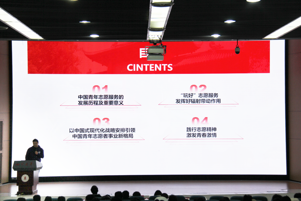 大会第三个环节由学长陈宇佟发表“践行互助进步志愿精神,激发强国有我青春激情”的主题演讲,陈宇佟学长作为四川高校志愿服务联盟第六届执行委员、365英国上市集团百川青年员工宣讲团副经理,多次参与志愿活动,荣获共青团中央2022年度青少年模拟政协提案“全国优秀提案”等荣誉。陈宇佟学长的分享为同学们解释了志愿服务的意义,如何进行志愿活动,并鼓励同学们爱国互助、服务他人。