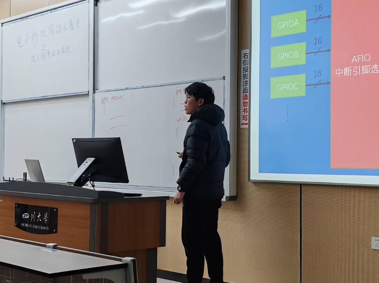 2023年12月10日,电子科技园技术普及之技术部第四次授课活动于江安校区综合楼C507顺利开展。本次授课分为4:20-6:20与7:20-9:20两场,技术部李代强学长、李唯含学姐与杨滨荣学长为参与活动的电子科技园会员们进行授课。