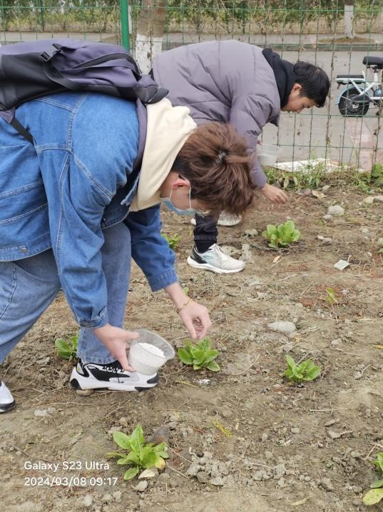 第一天,同学们分成几个小组,有序领取手套、铁锹等农具。初春的暖阳下,大家三五成群,撸起衣袖,相互配合,在满是石头杂草的作物间弯腰劳作。阳光洒在耕地间,仿佛是大地母亲的温情抚摸;此起彼伏的劳动声,仿佛是春天里的乐章,每一根拔出的杂草,都是对作物的尊重和爱护;每一声欢笑,都是对劳动的热爱和投入。在这一片绿意中,他们似乎找到了自己的位置,与自然融为一体,奏响着和谐的生命交响曲。