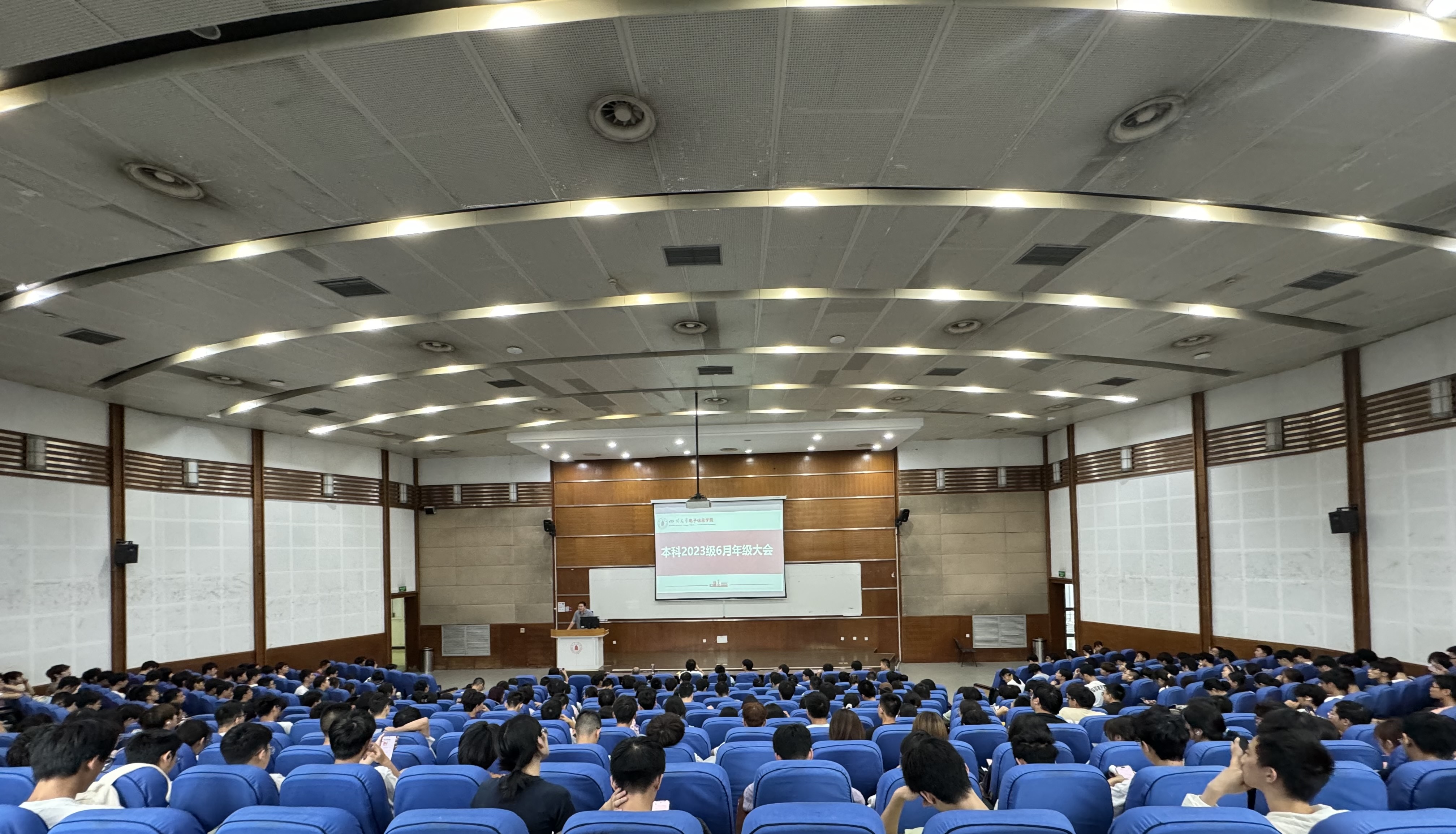 年级大会伊始,申鑫老师首先向同学们强调了关于日常行为规范的要求。他提醒同学们要按时归寝,寝室做到人走断电,注意消防安全等。同时,他也提醒同学们在上课时不要带耳机以维护正常有序的课堂秩序,同时避免错过重要信息。此外,申老师还针对即将到来的期末考试进行了指导,他鼓励同学们要沉着复习、冷静应考,不要作弊,诚信考试。