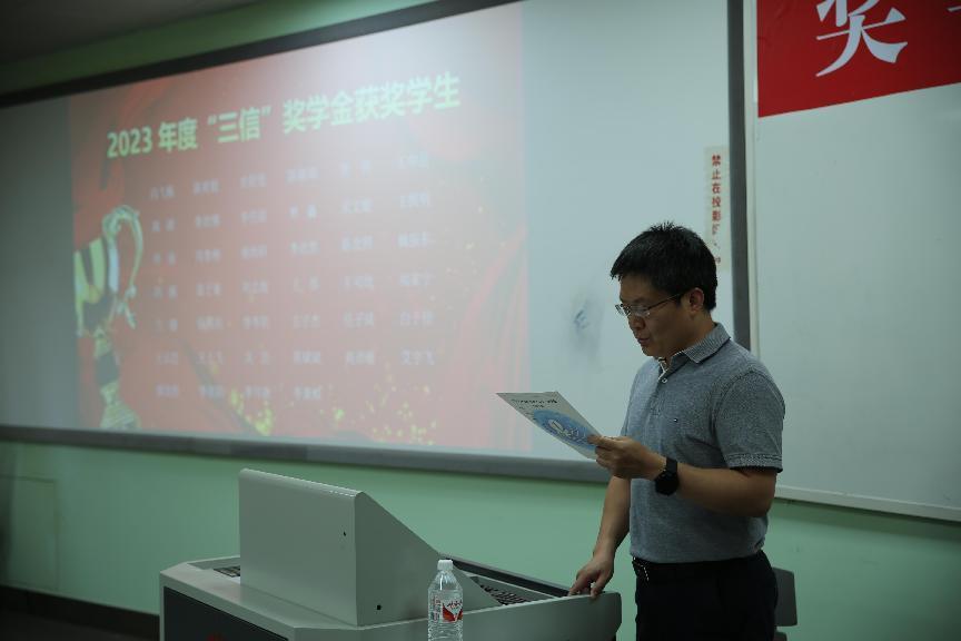 最后杨阳经理为“三信”获奖同学颁奖并发表讲话,杨经理感谢重庆三信电子有限公司近三十年一如既往,对公司学子持续关爱与资助,我们川大电子人要心怀感恩之情。杨经理希望所有川大电子人作为新时代的优秀青年,在“三信”奖学金的鼓励下,为中国电子信息产业的发展做出贡献,为社会主义现代化的崭新篇章努力奋斗。