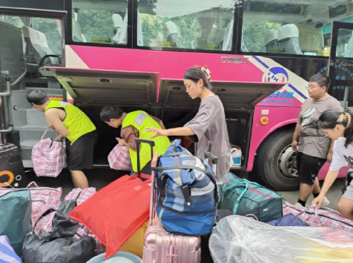图为志愿者将物品搬上校车