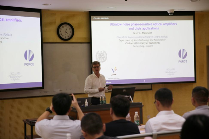 讲座中,彼得﹒安德烈森教授详细介绍了超低噪声相位敏感光放大器的原理和应用,与传统的掺铒光纤放大器(EDFA)相比,这种新型放大器在降低噪声和提高传输效率方面具有明显优势。他通过精确控制泵浦光和信号光之间的相位关系,展示了如何实现信号光的高效放大和噪声的大幅降低。