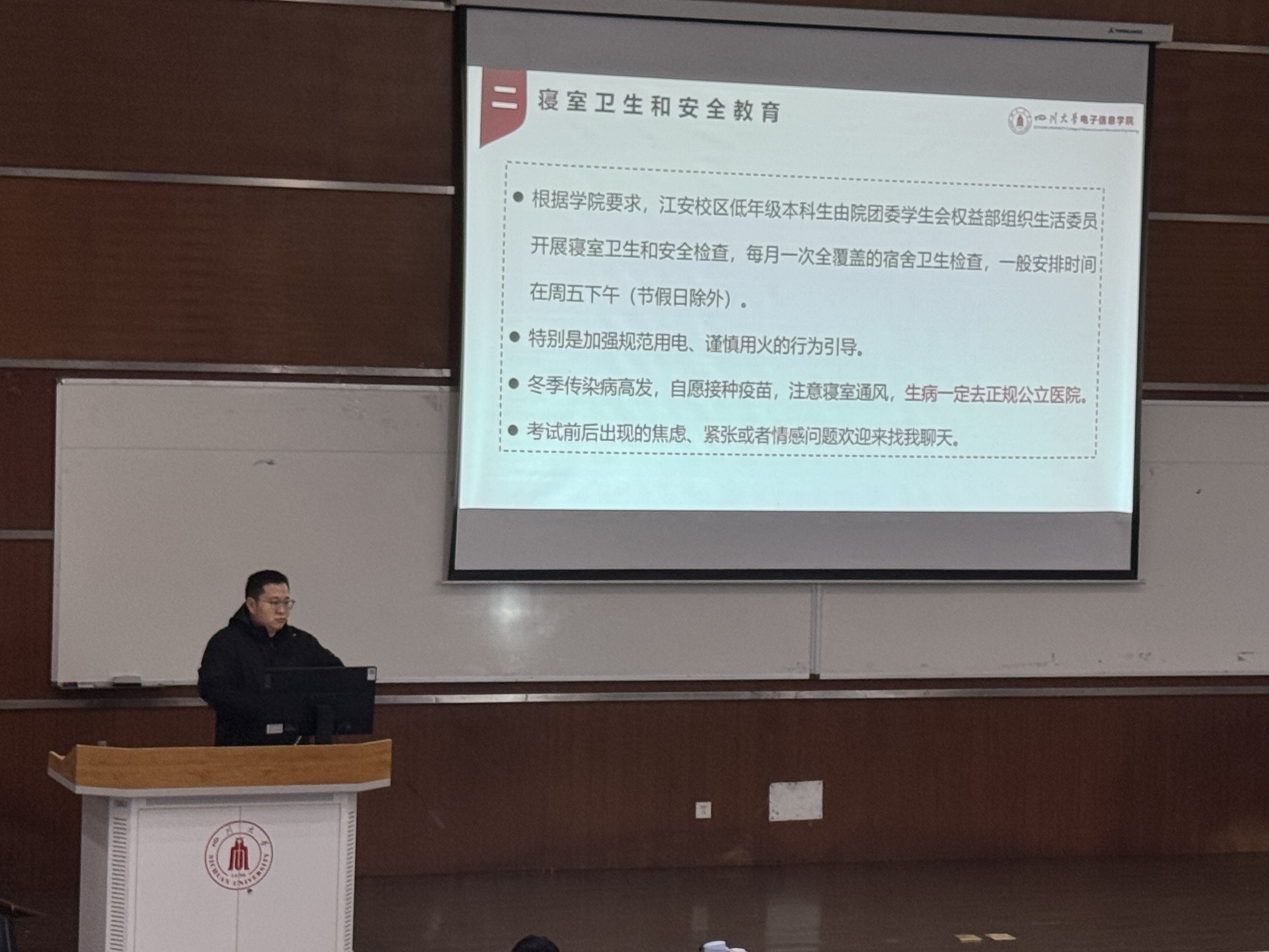 申老师提出将每月开展一次本年级的寝室卫生和安全检查,特别加强用电和用火的行为管理。冬季传染病高发,鼓励大家可自愿接种疫苗,注意保暖,生病时应去正规公立医院就医。同时,考试前后员工可能出现的焦虑情绪,申老师表示可随时找他进行沟通交流。