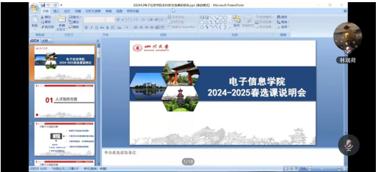 为助力大一新生深入理解春季选课的诸多规则,确保选课流程顺畅无阻,从而更快地融入老员工活,24级辅导员陈晓娟老师悉心筹划,特邀教务处的温文婷老师,围绕春季选课这一核心议题,为24级新生精心举办了一场详尽的说明会。此次说明会于2024年12月7日晚上7时,在腾讯会议平台如期举行,并取得了圆满成功。
