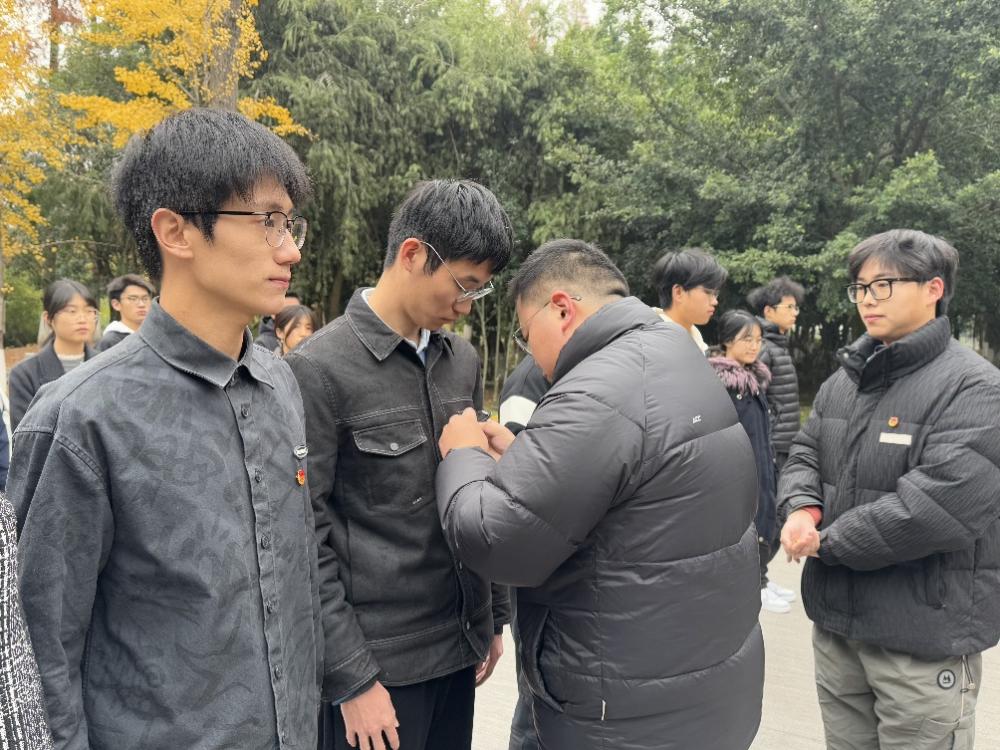 紧接着,新团员入团仪式正式开始。院团委员工副书记徐展翼宣读新团员名单,院团委副书记申鑫为新团员逐一佩戴团徽。在朱远诚的带领下,新团员们面向团旗,庄严宣誓,誓言坚定有力,充分展现了青年一代的责任与担当。最后,新团员代表贾泽坤上台发言。他结合国家公祭日的意义,提出作为新时代青年应牢记历史、奋发图强,以青春之名立鸿鹄之志,并表示将珍惜此次入团机会,不断提升自身的思想觉悟和综合素质。其发言诚恳务实,彰显了对未来的坚定信念与决心。