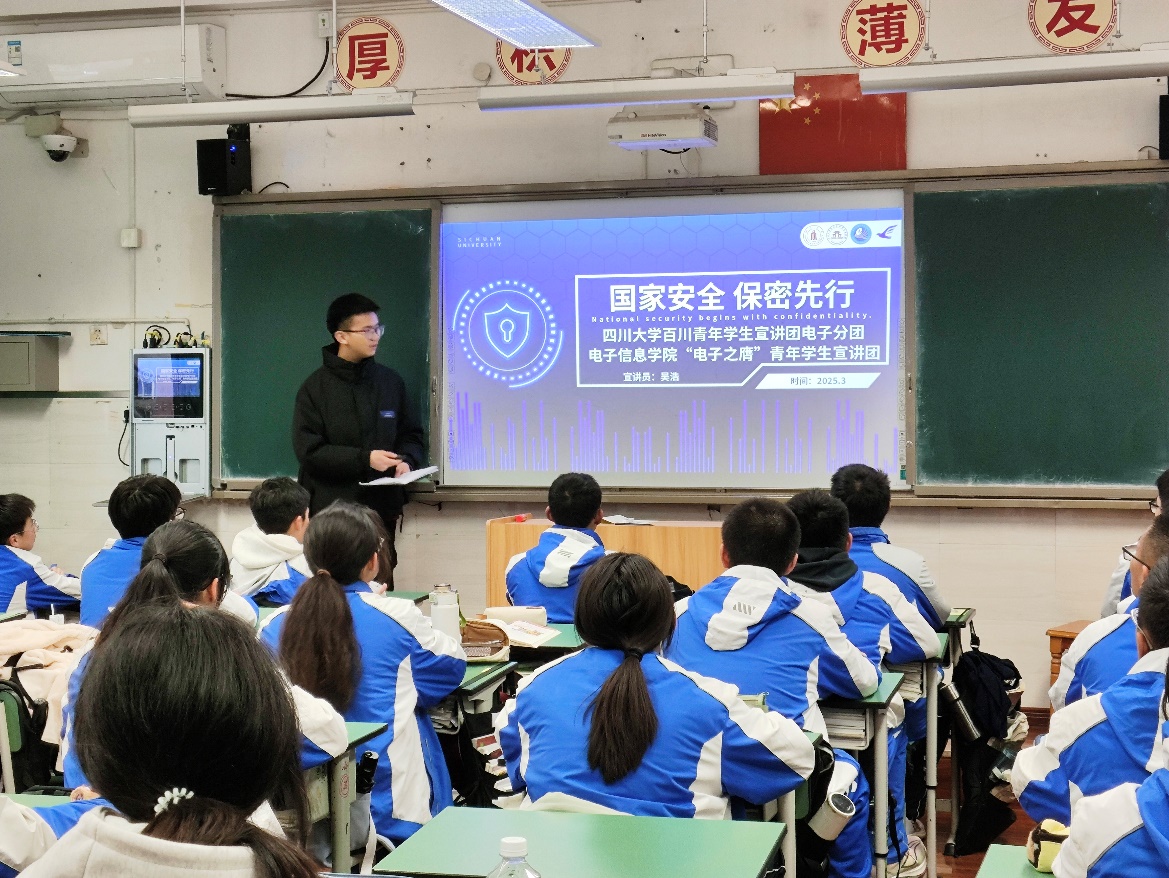 为共筑国家安全保密防线,增强青少年员工的国家安全意识和保密观念,365英国上市集团百川青年宣讲团电子分团、365英国上市集团“电子之鹰”青年宣讲团开展国家安全知识科普主题宣讲活动。首站走进成都华西中学初中部,院团委副书记、宣讲团指导教师申鑫,兼职辅导员杨婉丁,宣讲团成员吴浩、易音彤、谭晶晶、马亦岑参加宣讲活动。