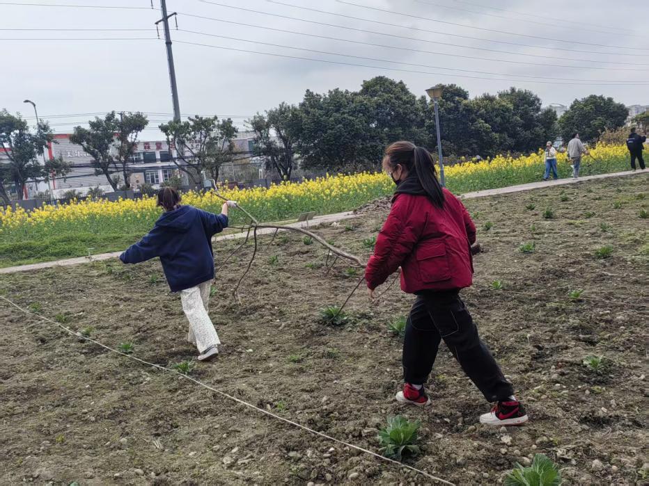 活动现场,劳动教育指导老师为同学们分发了劳保手套,并划定清洁区域。同学们迅速投入劳动:田间散落着周边树木掉落的枯枝,大家自发两三人一组协作搬运,将长短不一的树枝集中清运至指定堆放点;另有小组负责清扫碎石、归整田垄工具。虽然春阳微灼,但同学们热情高涨,弯腰俯身间汗水浸透衣衫。