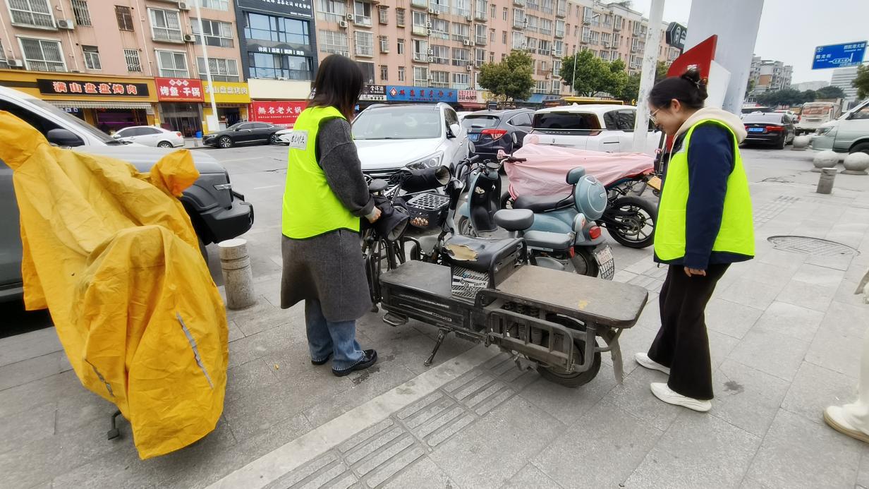 图为志愿者规范停放占用盲道的非机动车