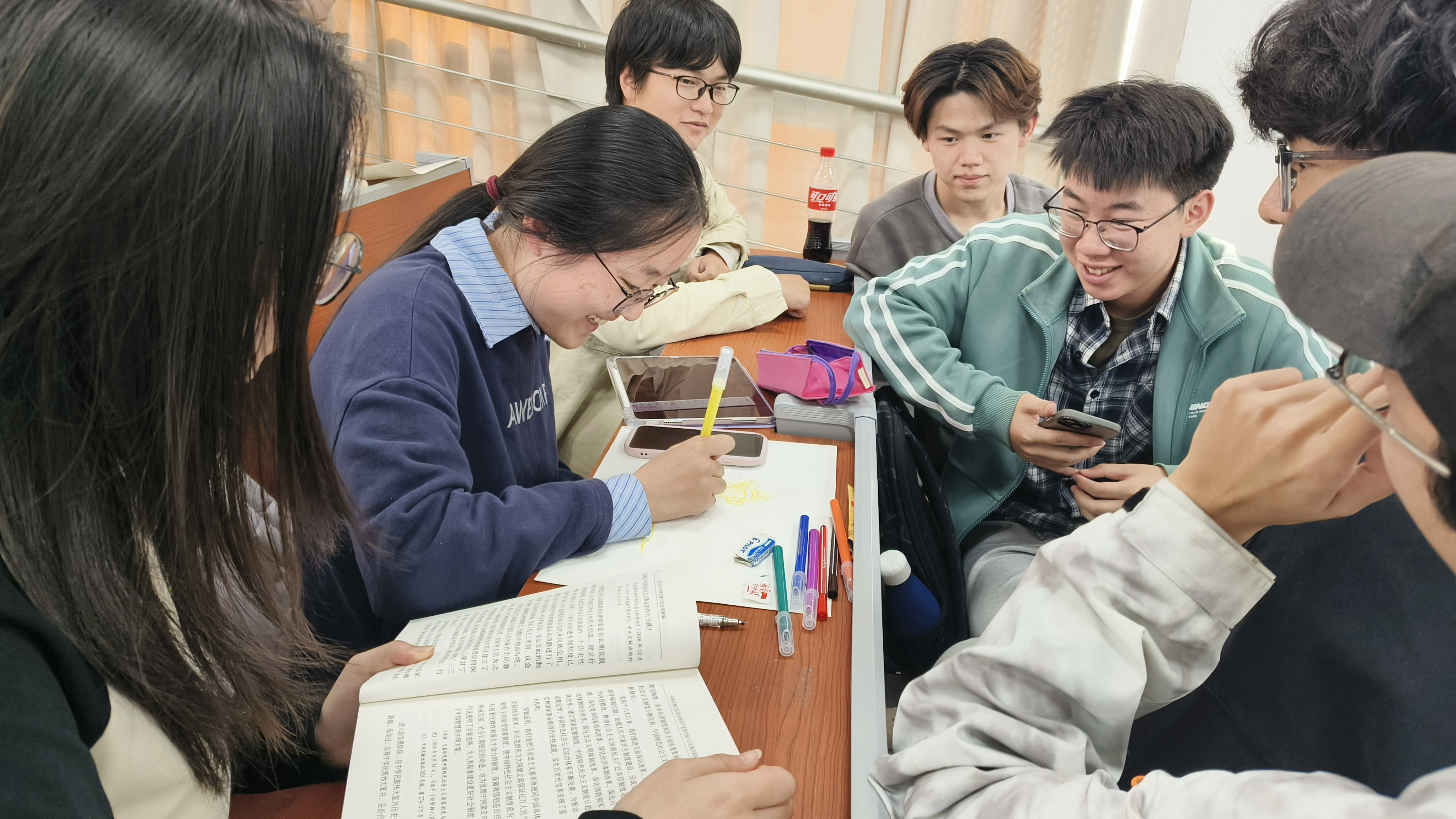图为7班与9班团支部成员阅读书籍并绘画思维导图