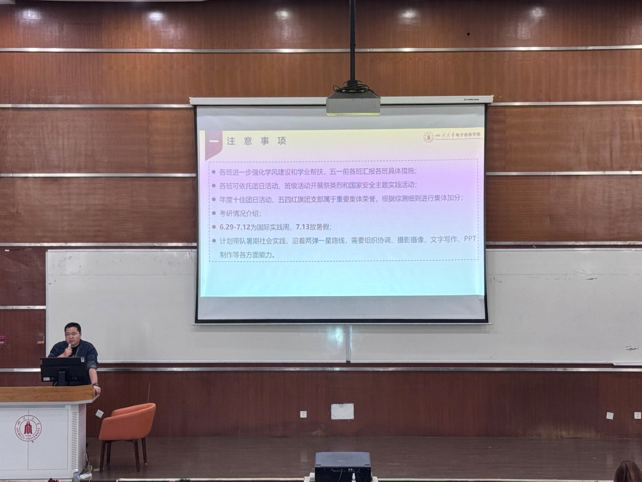 4月18日下午,2023级本科4月年级大会在江安校区综合楼C407顺利召开。会议由辅导员申鑫老师主持,全体2023级本科生参加。会议围绕学风建设、党团工作、暑期实践及学业安排等重点工作展开部署,为同学们下一阶段的学习与成长指明了方向。